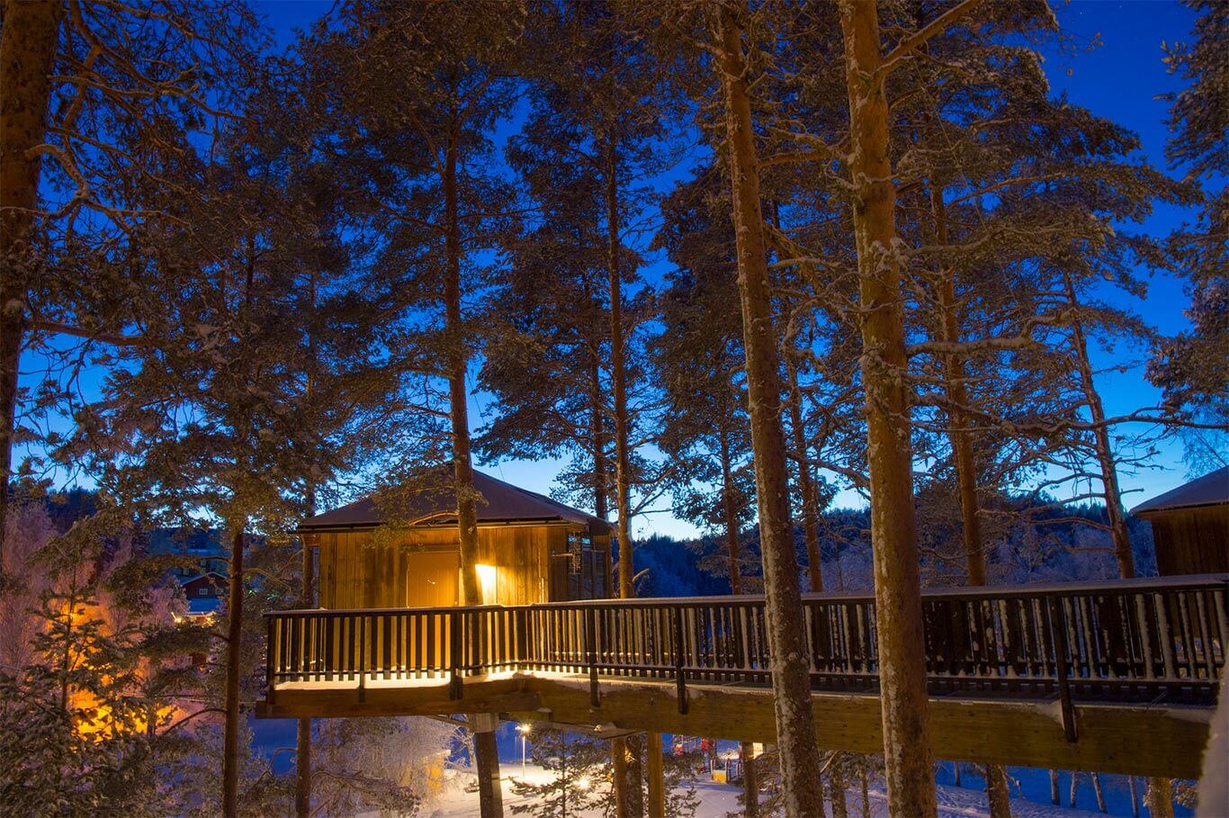 Wie de dag romantisch wilt afsluiten, kan overnachten bij bij ecohotel Granö beckasin, waar je in ‘birds nests’ verblijft. Het is een houten cabin die op hoge palen tussen de even hoge dennennaaldbomen zijn gebouwd. Vanuit het bijzondere ‘vogelnest’ heb je uitzicht op de besneeuwde boomtoppen en wie geluk heeft, kan ’s nachts vanuit z’n bed het noorderlicht zien.