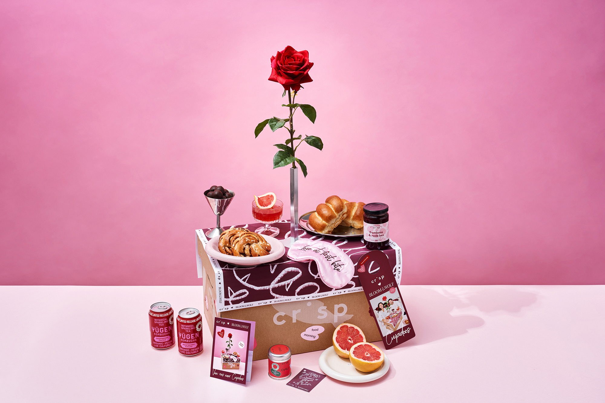 Liefde gaat door de maag: ook met dit Valentijnscadeau. Met de Cupidoos van Crisp x Bloom & Wolf tover je in een handomdraai een romantisch ontbijt op tafel. Of… op bed! De box komt met een luxe zijde Valentijnsroos van Bloom & Wolf. Extra pluspunt? Hij verwelkt niet, maar is nauwelijks te onderscheiden van een echte roos. De Cupidoos bevat eindeloos veel lekkers om je Valentijnsdag goed mee te beginnen. De kers op de taart is een recept en alle ingrediënten voor een heerlijke brioche-toast met ricotta, fruitspread en zelfgemaakte spicy honing.
